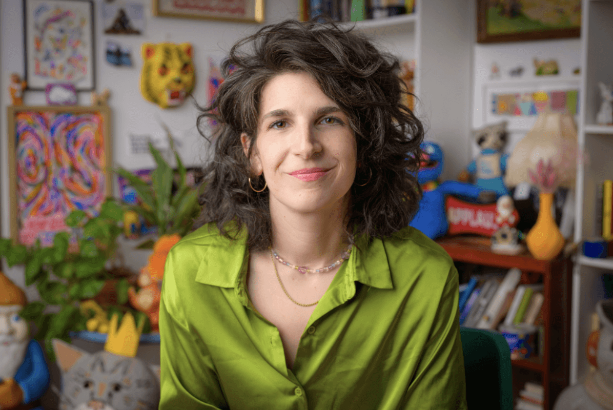 Hi, I'm Sara. I make pictures and books in fun new ways to help people practice being together and sharing. I like to try things out, like a rehearsal before a play, to imagine kinder and braver worlds. I look at how things are made, how people touch and move with them, and how stories travel from one person to another. This is called design, and design is a time machine. It helps people feel what life is like right now, and it can also help them remember the past. By caring about how things feel in our hands and by thinking about time in playful, bendy ways, I show how making designs can help us dream up and build better futures.